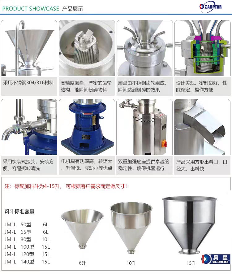 可代替并優(yōu)于石磨,砂磨機、球磨機、乳勻機、乳化機、三輥機、搗碎機等工作。